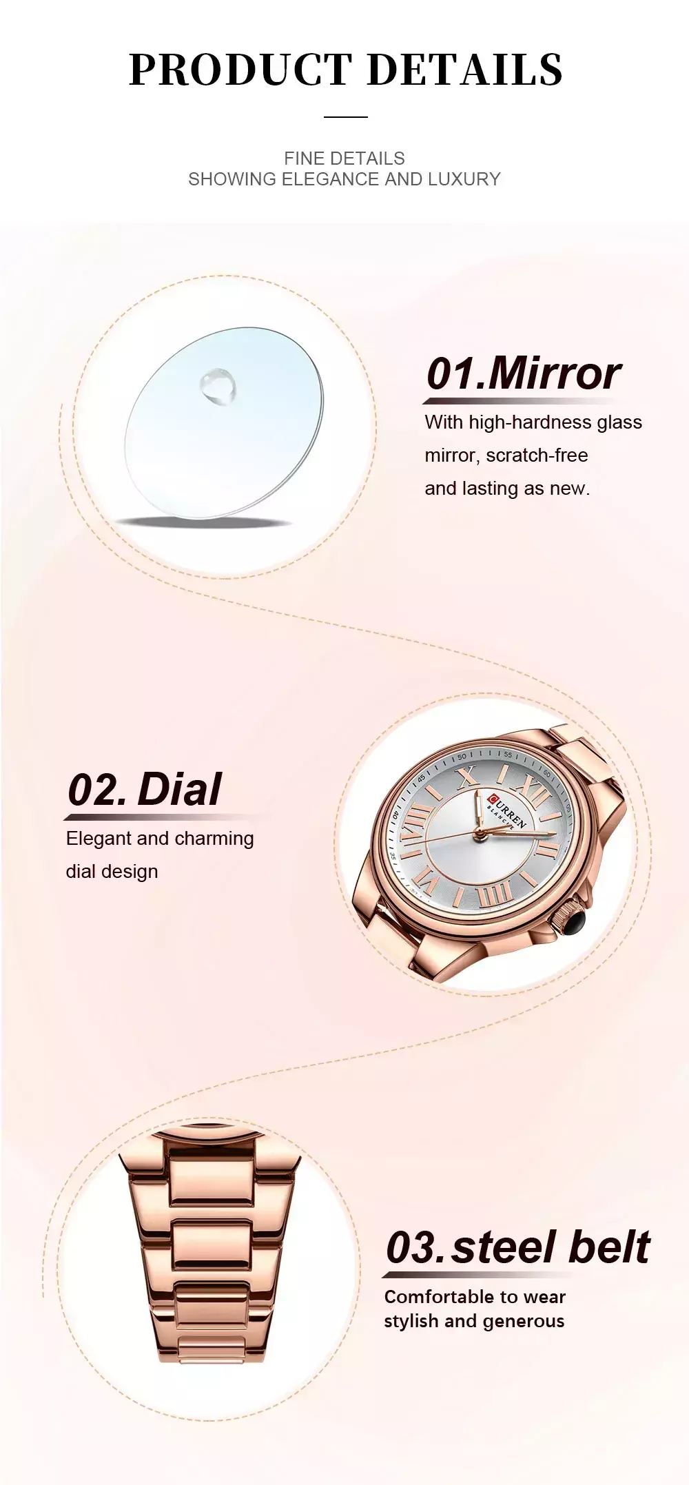 Além de seu design deslumbrante, o relógio de pulso feminino CURREN é construído com materiais de alta qualidade, garantindo durabilidade e resistência no uso diário. O mecanismo preciso assegura uma marcação do tempo confiável e exata, tornando-o não apenas uma peça de moda, mas também funcional e prática.